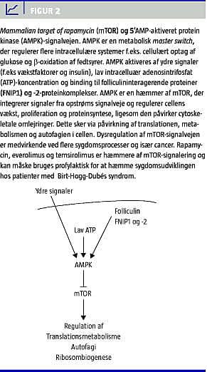 FLCN udgør en del af mammalian target of rapamycin (mTOR) og 5'AMP-aktiveret proteinkinase (AMPK)-signalvejen (Figur 2 ). AMPK fungerer som en vigtig energisensor i cellen, og mTOR-signalvejen fungerer som en af de vigtigste regulatorer for cellens vækst, proliferation og proteinsyntese, ligesom den påvirker cytoskelettet. Den C-terminale del af FLCN binder de follikulin-interagerende proteiner (FNIP)-1 og -2, hvorefter komplekset interagerer med AMPK og hæmmer mTOR [9, 10]. mTOR og AMPK virker tilbage på ekspressionen af FLCN og FNIP1 [7, 9]. AMPK kan fosforylere FNIP1, hvorved ekspressionen af FNIP1 hæmmes. Når mTOR blokeres med rapamycin eller påvirkes af lavt aminosyreniveau, ses et kraftigt fald i FLCN-fosforylering. Det samme ses ved hæmning af AMPK. En nedsat mængde fosforyleret FLCN medfører reduceret FLCN-ekspression [9].