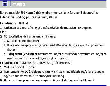 Det europæiske BHD-konsortiums forslag til diagnostiske kriterier for BHD-patienter er anført i Tabel 2 . Disse danner grundlag for en efterfølgende genetisk rådgivning og gentest, der kan kortlægge eventuelle mutationer i BHD-genet. I Danmark udføres denne gentest på Klinisk Biokemisk Afdeling, Rigshospitalet. Generelt tilrådes gentest først, når personen er myndig - med mindre særlige forhold taler for det modsatte. Hvis der kommer en profylaktisk medikamentel behandling, vil dette dog ændres, da behandlingen formentlig skal påbegyndes i barnealderen.