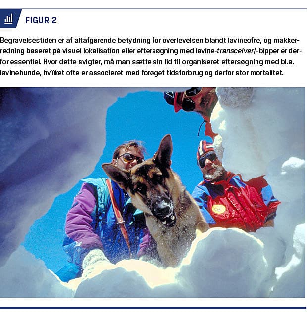 3) tilstedeværelse af en luftlomme og frie luftveje samt 4) sværhedsgraden af evt. traume. For komplet begravede er mortaliteten 52,5%, mens den blot er 4,2% for partielt begravede [8]. For komplet begravede lavineofre er overlevelsen inverst relateret til begravelsestiden (Figur 1). Således tyder en opgørelse af schweiziske og canadiske data på, at overlevelsen er højere end 80% ved en begravelsestid på op til 20 minutter [9]. Herefter sker der et dramatisk fald til en overlevelse på blot 30% blandt ofre, der har været begravet i op til 35 minutter. Denne hastigt faldende overlevelseskurve tilskrives først og fremmest asfyksi, som i det hele taget er den væsentligste dødsårsag ved lavineulykker [9, 10]. Dødeligheden falder langsomt efter den kritiske fase efter omkring 35 minutter med en relativt flad kurve frem til 90 minutters begravelsestid (Figur 1). Dette formodes at være begrundet i tilstedeværelsen af luftlomme og frie luftveje kombineret med det fysiologisk nedsatte iltforbrug sekundært til hypotermi, og hos netop sådanne ofre er der beskrevet overlevelse uden sequelae efter lange begravelsestider af mere end to timers varighed, svær hypotermi ned til 19 °C og hjertestop [11, 12].