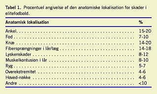Anatomiske lokalisationer for skader angives i litteraturen [7, 8] nogenlunde ens som vist i Tabel 1 . Størst variation i skadesfrekvens findes for lårskader og skyldes utvivlsomt definitionsproblemer mht. overuse, krampe og egentlig fiberskade.