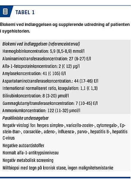 Kort efter indlæggelsen kastede han 400 ml frisk blod op og blev tiltagende hypotensiv med blodtryk på 80/39 mmHg. Biokemisk fandt man anæmi og hyperammoniæmi, men i øvrigt normale leverbiokemiske forhold (Tabel 1). Der blev påbegyndt behandling