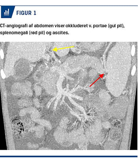 En CT-angiografi af abdomen viste obliteret vena porta med udtalte kollateraler og betydelig splenomegali (13 cm) (Figur 1). I dagene efter den primære banding var der flere episoder med reblødning. Patienten blev behandlet efter gældende retningslinjer med terlipressin, Sengstakensonde og gastroskopi med banding. Pga. fortsat ukontrollabel blødning blev han splenektomeret, hvorefter tilstanden blev stabiliseret. Han blev udredt for portal hypertension og leversygdom (Tabel 1), men der blev ikke fundet nogle årsager fraset trombosering af vena porta på grund af NVK i neonatalperioden.