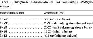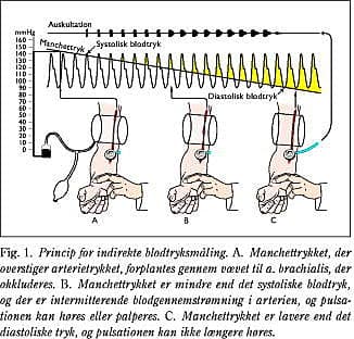 Blodtrykket måles på den let flekterede overarm med patienten siddende, idet god arm- og rygstøtte sikres. Manchetten anbringes tætsiddende på overarmen uden at give stase, således at manchettrykket omgående under inflation kan forplante sig til det underliggende væv. Manchetten skal anbringes direkte på huden og ikke fx uden på patientens (skjorte)ærme. Den bør placeres således, at underkanten er et par cm fri af albuebøjningen. Gummiballonen i manchetten skal nå helt rundt om armen, og have en bredde, der svarer til ca. 40% af overarmens cirkumferens. Tre manchetstørrelser (gummiballoner) bør være tilgængelige og vil kunne dække de fleste voksne patienters arme (Tabel 1). Til børn og voksne med tynde overekstremiteter anvendes en særlig børnemanchet. Manchetten opblæses hurtigt til 20-30 mmHg over det systoliske tryk, hvorefter blodgennemstrømningen i a. brachialis ophører (Fig. 1). Stetoskopets membran placeres ud for a. brachialis umiddelbart distalt for manchetten. Der tilstræbes en udluftningshastighed på 2 mmHg/hjerteslag. Det systoliske tryk registreres ved Ko-rotkoff fase I, hvor lyden høres første gang og det diastoliske tryk ved Korotkoff fase V, hvor lyden forsvinder helt. Hos børn kan det være nødvendigt at måle det diastoliske blodtryk ved fase IV, hvor lyden skifter karakter. Herefter tages trykket hurtigt af ballonen, og der bør hengå mindst et minut inden næste måling. Hvis ikke Korotkoff-lydene høres klart, kan det være en fordel at blæse manchetten hurtigt op, og eventuelt foretage opblæsning med armen eleveret, for herefter at sænke den under udluftningen.