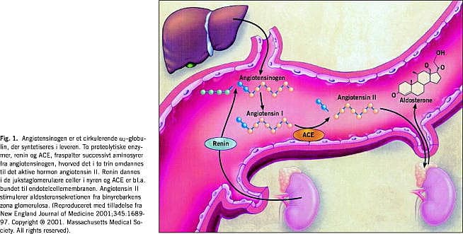 Det biologisk aktive peptid angiotensin II (ANG II) dannes ved to enzymatiske reaktioner. RAS forekommer både som et cirkulerende (Fig. 1 ) og et lokalt vævssystem. ANG II medierer sin virkning via mindst to plasmamembranreceptorer, AT1 og AT2 , som begge er klonede og farmakologisk velkarakteriserede.