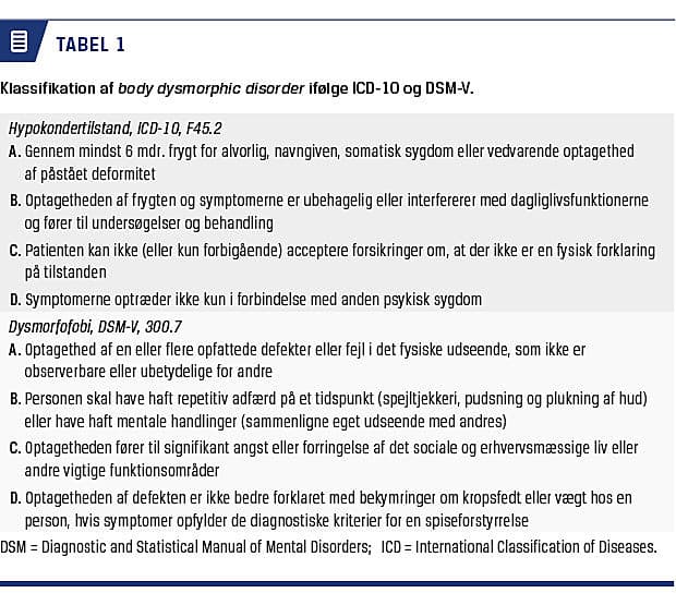 De nye kriterier for BDD i DSM-5 afspejler forbindelsen til OCR, men bidrager også til at differentiere BDD fra andre lidelser såsom alvorlig depression og socialfobi. Patienter med BDD undgår hyppigt sociale situationer, hvor de mener, at deres udseende kan blive evalueret. Optagetheden af udseendet kan blive så vanskelig for patienterne, at de finder det nødvendigt at bruge flere timer eller hele dagen på at tjekke sig selv. De er meget optaget af fejl i deres kropslige fremtoning, fejl, som enten ikke kan bemærkes eller kun svagt bemærkes af andre (Tabel 1) [3].