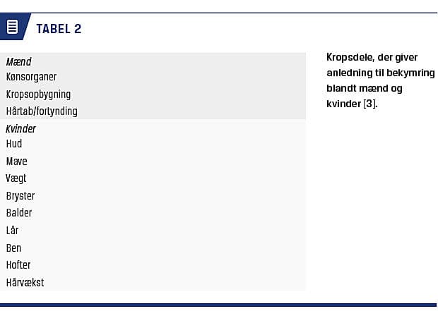 Forekomsten af BDD i USA er lidt højere blandt kvinder (2,5%) end blandt mænd (2,2%) og opstår hyppigst hos kvinder i alderen 35-50 år og mænd yngre end 35 år [10, 12]. En anden undersøgelse har vist, at mænd med BDD typisk er mere tilbøjelige til at være single og bo alene end kvinder med BDD (Tabel 2) [13]. Retrospektive data tyder på, at alderen for BDD-debut er 16 ± 6,9 år (standarddeviation) [14].