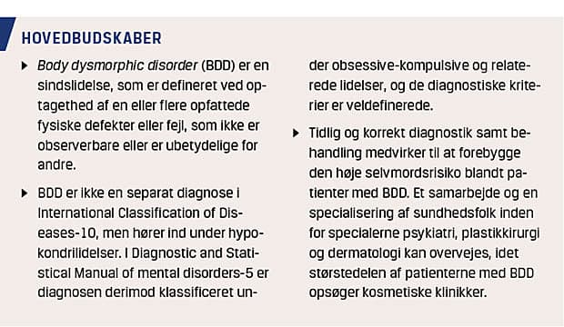 Dysmorfofobi eller body dysmorphic disorder (BDD) er en sindslidelse, hvor man er præget af en stor optagethed af eget udseende. Personer med BDD har en høj selvmordsrisiko [1]. I denne artikel præsenteres den nyeste viden inden for ætiologi, patofysiologi og behandling, herunder antallet af kosmetiske indgreb.