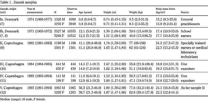 - Andersen E, Andersen H, Hutchings B, Peitersen B, Rosen J, Thamdrup E et al. Højde og vægt hos danske skolebørn 1971-1972. Ugeskr Læger 1974; 136: 2796-802.