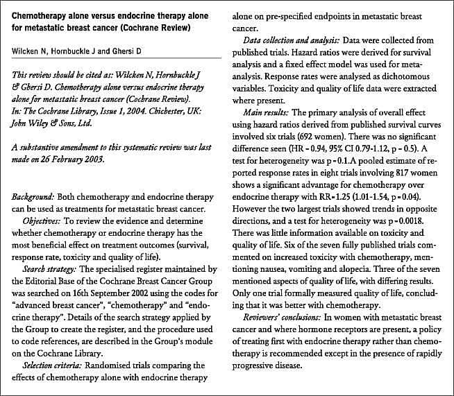 - Wilcken N, Hornbuckle J, Ghersi D. Chemotherapy alone versus endocrine therapy alone for metastatic breast cancer (Cochrane Review). In: The Cochrane Library, Issue 2, 2003. Oxford: Update Software.
