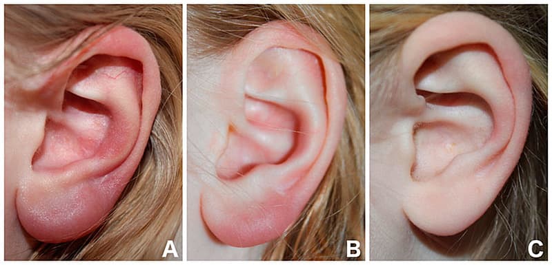 Hos en toårig pige udvikledes der langsomt en isoleret hævelse og rødme af den ene øreflip. Der blev søgt egen læge ca. en måned efter symptomernes opståen. Egen læge ordinerede hydrocortison på mistanke om eksem bag øret, men dette var uden effekt. Efterfølgende sås pigen af en praktiserende øre-næse-hals-læge, som ved otologisk undersøgelse ikke fandt andet end den hævede, røde øreflip. Anamnestisk havde pigen for ca. seks måneder siden været på sommerferie i Sverige (Stockholms skærgård), hvor forældrene havde fjernet flere flåter fra hende, men der var ikke observeret erythema migrans (EM). Man havde mistanke om Borrelia-lymfocytom (BL). Serologisk undersøgelse støttede diagnosen, idet man fandt immunglobulin (Ig) G-Borrelia burgdorferi-antistoffer, men ikke IgM-antistoffer [1, 2].