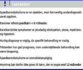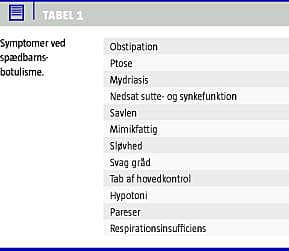 Selv om fødevarebåren botulisme - »pølseforgiftning« - i Danmark er en meget sjælden form for fødevareforgiftning, er den kendt af de fleste læger. I modsætning hertil er spædbarnsbotulisme (SB) et mindre kendt og muligvis underdiagnosticeret syndrom. Hvor fødevarebåren botulisme skyldes indtagelse af fødevarer med præformeret toksin, skyldes SB indtagelse af sporer. Sporerne omdannes i tarmkanalen til toksinproducerende bakterier. Kolonisering kan finde sted, fordi den normale tarmflora, som hos ældre individer kan beskytte mod formering af Clostridium botulinum, endnu ikke er stabil hos spædbørn. Efter kolonisering frigøres botulinumtoksin, som optages gennem tarmvæggen. Tilstanden har et bredt klinisk spektrum, der strækker sig fra let kranienervepåvirkning, hypotoni og obstipation til progredierende generaliseret symmetrisk slap parese og respiratorkrævende kompromitteret respiration. Kendskab til denne potentielt fatale tilstand er vigtig. Tidlig diagnose og behandling med antitoksin er afgørende, eftersom en betragtelig andel af børnene i modsat fald vil få behov for langvarig og intensiv understøttende behandling [1-3].