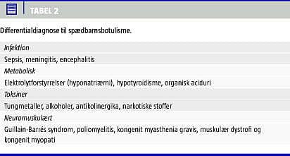 Der er mange differentialdiagnoser til SB (Tabel 2 ). Barnet kan initialt mistænkes for sepsis eller neurologisk lidelse. Udfaldene ved poliomyelitis er associeret med asymmetriske fund og pleocytose i cerebrospinalvæsken (CSV). Kongenit myasthenia gravis kan usandsynliggøres eller afkræftes ved tensilontest. Guillain-Barrés syndrom udviser typisk ascenderende pareser og er sjældent hos børn under et år