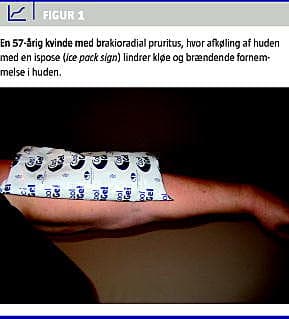 Brakioradial pruritus er en neuropatisk dermatose, som typisk ses hos midaldrende kvinder og første gang blev beskrevet som en usædvanlig reaktion på sollys hos udendørsarbejdere i Californien [1]. På de skandinaviske breddegrader forekommer symptomerne typisk fra sidst på sommeren og frem til jul. Brakioradial pruritus er sjældent blevet beskrevet, men er formentlig underrapporteret. Kløen er karakteristisk lokaliseret dorsalt på underarmene og lateralt på overarmene med fravær af kløe på solbeskyttede hudområder. Symptomerne er ude af proportion med de objektive fund. Den karakteristiske kløe, lokalisationen og ice pack sign er karakteristisk eller næsten patognomonisk for diagnosen [2].