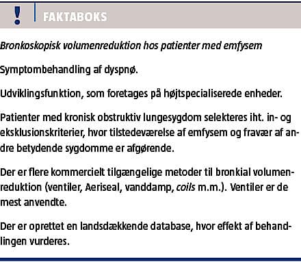 I denne artikel gennemgås rationalet for bronkoskopisk volumenreduktion samt indikationer, kontraindikationer, procedurer og planlagte opfølgningsregimer.