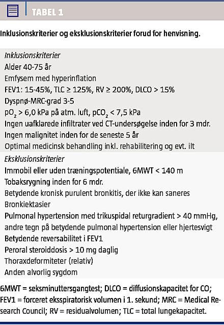 Patienterne med emfysem bør være i optimal medicinsk behandling og have gennemgået KOL-rehabilitering før henvisning. Da der er tale om en patientpopulation, som ubehandlet har høj morbiditet og mortalitet, skal der i den samlede kliniske vurdering også indgå en vurdering af komorbiditet, skrøbelighed og forventet overlevelse.