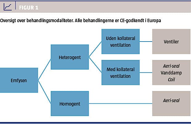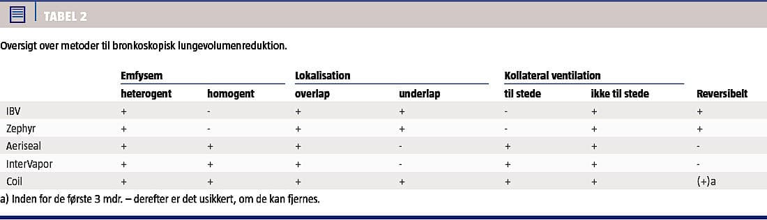 Der findes flere forskellige metoder til bronkoskopisk volumenreduktion. Den hyppigst anvendte er indsættelse af endobronkiale ventiler, hvilket er den mest gennemprøvede, men andre muligheder er airway stents eller coils, brug af polymerskum eller vanddamp. Indikationen for de forskellige modaliteter fremgår af Tabel 2 og Figur 1.