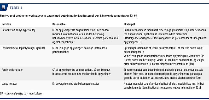 CP’s betydning for kvaliteten af de kliniske notater var derimod behandlet i læserbreve og ledere i videnskabelige tidsskrifter samt i politikker og retningslinjer. Litteraturen kredsede omkring fire problemer: CP kan 1) introducere helt nye typer af fejl, hvor tekst får ændret betydning efter kopiering til andre dele af samme eller andre patienters journal, 2) bidrage til fastholdelse af fejlagtige journaloplysninger, 3) give forvirrende notater med modstridende ny og kopieret tekst og endelig 4) bidrage til lange notater, i USA betegnet note bloat (Tabel 1).