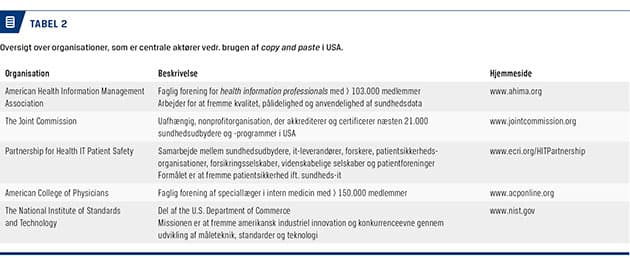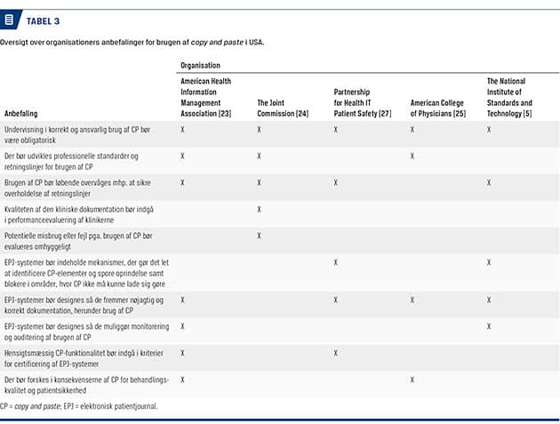 Indførelsen af EPJ har øget den tid, læger bruger på dokumentation. Til imødegåelse af dette giver EPJ mulighed for CP. I USA har man i undersøgelser dokumenteret, at flertallet af læger anvender CP og ønsker CP bevaret [22]. Der foreligger ingen kvantitative data for CP’s betydning for patientsikkerheden, men CP er i den faglige debat blevet knyttet til fire typer af problemer med fejlbehæftede og ulæselige notater (Tabel 1). Erkendelsen af disse har i USA fået centrale aktører (Tabel 2) til at formulere en række modforholdsregler (Tabel 3).