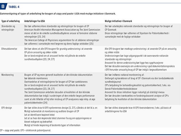 Ud over disse generelle anbefalinger foreslår AHIMA [23] øget offentlig regulering og monitorering på området samt mere forskning i »the potential and actual impact of copy/paste on quality of care, patient safety, fraud and abuse, and legal liability, as well as on effective strategies for preventing negative consequences from the use of this functionality«.