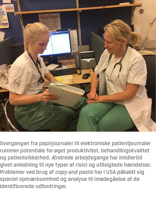 Elektroniske patientjournaler (EPJ) rummer potentiale for øget produktivitet og behandlingskvalitet og for bedre patientsikkerhed. I USA har der imidlertid også vist sig uforudsete problemer med forskellige typer af risici og utilsigtede hændelser (UTH) [2]. Især brugen af copy and paste (CP) har tiltrukket sig opmærksomhed og debat [3-5], hvor CP defineres som udvælgelse/markering af data og tekst fra andet sted med efterfølgende gengivelse under anvendelse af genvejstast eller mus [6]. Siegler & Adelman satte ord på problematikken i en leder i The American Journal of Medicine, hvor de beklagede den forringede kvalitet af de kliniske notater: