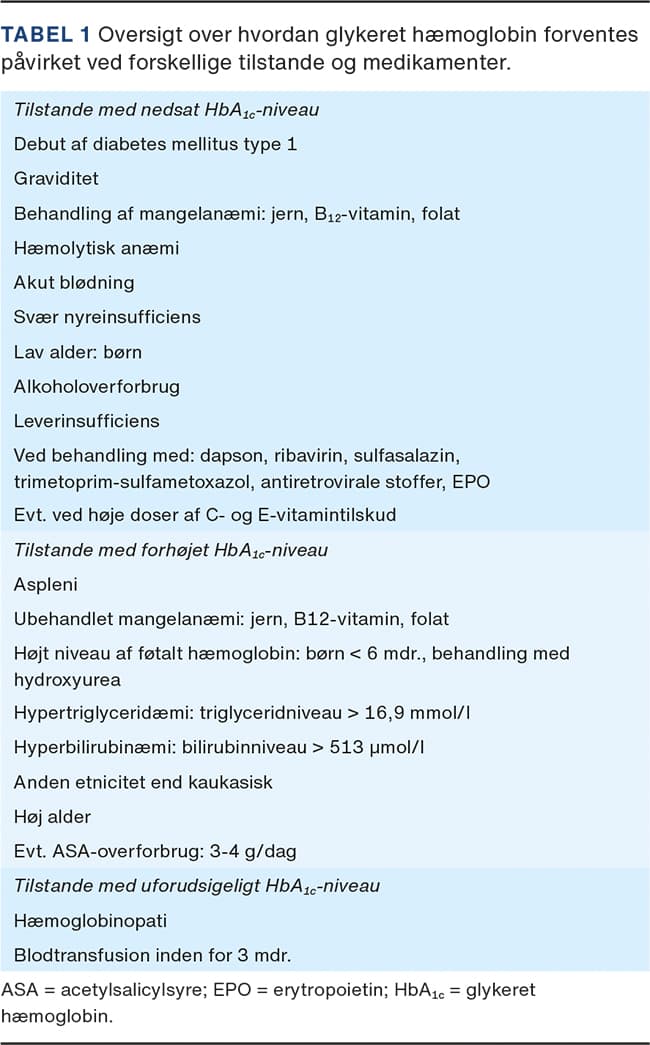 Hvis en af de ovenstående nævnte kliniske tilstande gør sig gældende, bør HbA1c-niveauet aldrig anvendes til diagnosticering – se Tabel 1 for opsummering.