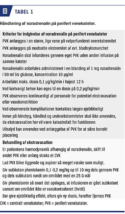 Følgende forslag til en klinisk retningslinje til administration af NA via PVK er baseret på den tilgængelige litteratur (Tabel 1). Kun i et af de refererede studier benyttede man en egentlig protokol for administration af vasopressorer via PVK og observerede ikke lokal vævsskade [3]. Det anbefales at anvende en blanding af NA på 10 mikrogram/ml. Såfremt man f.eks. giver patienten NA 0,1 mikrogram/kg/min, vil man hos en patient på 80 kg skulle infundere 48 ml/t af blandingen. Pga. det store volumen kan man hurtigt erkende en evt. ekstravasation. NA skal infunderes gennem et særskilt PVK uden anden infusion på samme kateter og være synligt for det ansvarlige sundhedspersonale, således at en vasokonstriktion omkring venekateteret opdages i tide. Vasokonstriktion, ekstravasation og længerevarende behov for infusion af doser af NA over 0,1 mikrogram/kg/min i mere end 12 timer må anses for at være en kontraindikation for forsat perifer infusion, og man skal da i stedet anlægge et CVK.