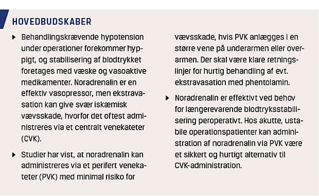 Behandlingskrævende hypotension under operationer er en hyppig hændelse. I et nyligt publiceret prospektivt klinisk studie angav man, at 16,4% af patienterne fik en eller flere episoder med hypotension under operationen [1]. Længerevarende hypotension kan medføre alvorlige postoperative komplikationer pga. hypoperfusion af vitale organer såsom nyrer, hjerne og hjerte [2]. Optimering af det kardiovaskulære system og herved stabilisering af blodtrykket kan foretages med væsketerapi og administration af vasoaktive stoffer. Ephedrin og phenylephrin er de hyppigst anvendte vasoaktive stoffer. Ved behov for længerevarende blodtryksstabilisering har begge stoffer deres begrænsninger [3, 4]. Noradrenalin (NA) kan derfor overvejes i situationer med behov for længerevarende vasoaktiv behandling. NA administreres normalt via et centralt venekateter (CVK), da det er en kraftig vasokonstriktor, hvorfor der ved kontinuerlig indgivelse af NA via et perifert venekateter (PVK) er risiko for ekstravasation og iskæmisk vævsskade [5, 6]. Anlæggelse af CVK er kun berettiget ved større operationer hos patienter med en begrænset kardiovaskulær reserve [3]. Formålet med denne artikel er at beskrive de hyppigst anvendte vasoaktive medikamenter, diskutere fordele og ulemper ved perioperativ administration af NA via PVK samt angive retningslinjer for brug af NA via PVK.