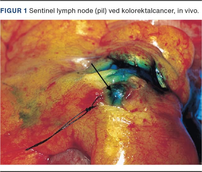 SN håbes også at kunne benyttes til at muliggøre nedskalering af den kirurgiske behandling af kolorektalcancer. Ved in vivo-fund af SN (Figur 1) kan der udtages biopsi, som undersøges peroperativt med en one-step nucleic acid amplification-teknik. Ved negativ SN-status kan patienter med lokaliseret sygdom undgå en omfattende segmentresektion og nøjes med en mindre lokalresektion af tumor evt. bare som endoskopisk behandling med deraf følgende nedsat mortalitet og morbiditet som gevinst [4, 5]. Ikke mindst vil bevarelse af blodkar til tarmen ved en lokalresektion nedsætte risikoen for iskæmi ved anastomosen, og en lokalresektion vil sandsynligvis også nedsætte risikoen for behandlingskrævende kroniske forstyrrelser i tarmfunktionen, som man ellers ser hos op mod 10% af de patienter, der har gennemgået tarmresektion for coloncancer [17].