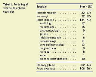 Materiale og metoder: Til 242 danske afdelinger/afsnit/klinikker blev der udsendt et tosidet spørgeskema til skriftlig besvarelse. Der blev rykket to gange.