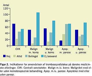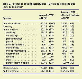 Resultater: Svarprocenten var 82. På 90% af afdelingerne blev der anvendt tromboseprofylakse, men kun på 69% af de intensive afdelinger, 36% af de neurologiske afdelinger og 22% af de internmedicinske afdelinger blev det anvendt efter fast instruks. Der var ingen forskel på storbysygehuse og andre sygehuse. Den hyppigste indikation var sengeleje.