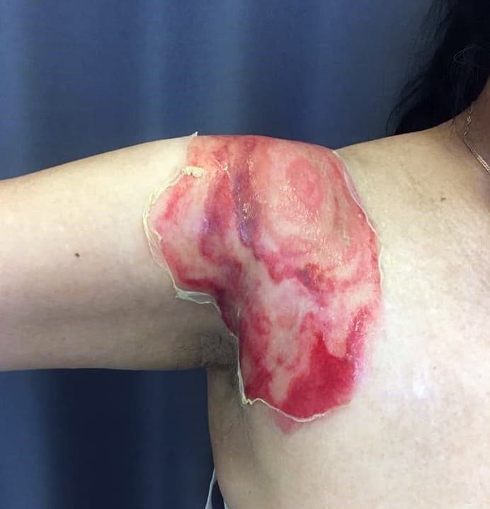 En 46-årig kvinde, som havde systemisk lupus erythematosus og Sjögrens syndrom og blev behandlet med mycophenolat mofetil, hydroxychloroquin og prednisolon, blev vurderet i dermatologisk regi fem dage efter debut af to hastigt udviklende hudlæsioner på højre skulder og underarm.