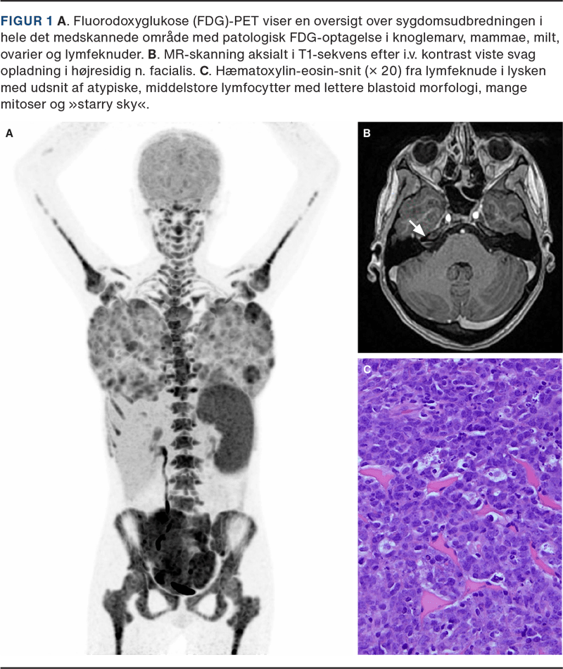 Perifert blodudstryg og flowcytometri, biopsi fra glandler samt PET-CT påviste leukæmiseret BL stadie IV med knoglemarvsinvolvering og ekstranodal affektion i mammae og ovarier (Figur 1 A). En MR-skanning viste let opladning langs højresidig n. facialis (Figur 1 B). Histologiske tests viste klassisk BL med Ki-67 på 100% og MYC-translokation (Figur 1 C).
