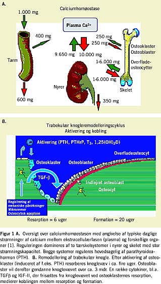 Et andet homøostatisk system eksisterer i skelettet og sikrer opretholdelse af knoglemasse, struktur og styrke under variable levevilkår og hormonale påvirkninger [7]. Dette system hviler på to grundprincipper. For det første sker der en fortsat udskiftning af skelettet livet igennem, således at træthedsfrakturer (microdamage ) repareres, de indlejrede osteocytter udskiftes, og strukturen tillempes variationer i belastningen. For det andet er knoglenedbrydning og knogleopbygning koblet i tid og rum, således at knogleresorption altid følges af formation (Figur 1B). I tilfælde af konflikt mellem calciumhomøostasen og den skeletale homøostase vil calciumhomøostasen som hovedregel blive prioriteret højest.