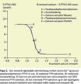 PTH, et peptidhormon på 84 aminosyrer, dannes udelukkende i glandulae parathyroideae. PTH-sekretionen stimuleres af hypokalcæmi og hæmmes af hyperkalcæmi gennem CaSR i cellemembranen koblet til guaninnukleotidbindende protein (G-protein) [3, 8], således at relationen mellem P-Ca2+ og P-PTH er omvendt S-formet (Figur 2 ). Calcium-set-point defineres som den Ca2+ -koncentration, der hæmmer den maksimale sekretion med 50% [8]. Aktive 1α -hydroxylerede D-vitamin-metabolitter reducerer set-point og hæmmer PTH-sekretionen. Klinisk findes et forhøjet calcium set-point ved primær hyperparathyroidisme, mens set-point er reduceret ved familiær hypokalciurisk hyperkalcæmi. PTH degraderes til N- og C-terminale fragmenter i såvel gll. parathyroideae som i perifert væv. Intakt PTH og C-terminale fragmenter udskilles renalt. PTH bindes til membranlokaliserede PTH/PTHrP-receptorer i en række forskellige væv herunder nyrer, skelet og tarm, der er de væsentligste effektororganer inden for calciumhomøostasen.