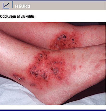 II. En 49-årig kvinde med leukocytoklastisk vaskulitis fik pludselig svær aktivitet i sin vaskulitis (Figur 1). Den blev forsøgt behandlet med prednisolon, azathioprin, ciclosporin og til sidst infliximab. Alle forprøver i form af blodprøver og røntgen af thorax viste normale forhold. Patienten havde dog ca. 40 pakkeår bag sig. Et år efter, da hun kom til sin syvende infliximabinfusion, fandt man en forstørret lymfeknude i højre aksil. Hun fik kort efter konstateret metastaserende lungekræft, hvorefter ciclosporin og infliximab blev seponeret. Hun afgik ved døden to et halvt år efter, at hendes vaskulitis var blusset op.