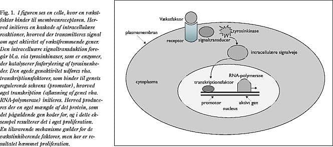 Vækstfaktorer binder sig til membranreceptorer, hvorved der induceres en kaskade af intracellulære reaktioner, som oftest involverer fosforylering af mange forskellige proteiner og enzymer (Fig. 1 ). Receptorernes øgede aktivitet kan skyldes amplifikation af genet for receptoren, øget transskription af genet med deraf øget mRNA-mængde, øget translation af mRNA med deraf øget mængde af receptorproteinet eller andre mekanismer. Endelig kan receptoren være en modificeret udgave af den oprindelige receptor, således at der konstant sendes signal om proliferation til trods for, at der ikke er bundet en vækstfaktor til receptoren (10). Et eksempel er mammacancer med erbB2 -receptoren, der er homolog til EGF-receptoren.
