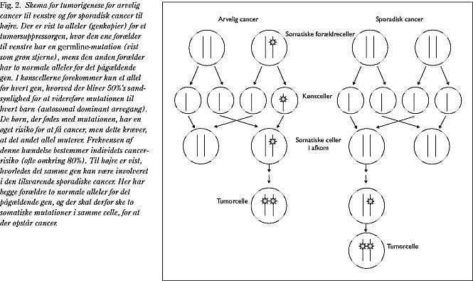 Knudson fremsatte i 1971 en teori om tumorsuppressorgener, der var baseret på epidemiologiske studier af retinoblastom, som findes i en arvelig form og en sporadisk form (12). Den arvelige form er karakteriseret ved tidlig debut og bilateral affektion, hvorimod den sporadiske form udviser senere debut og unilateral sygdom (Tabel 1). Hypotesen indebærer, at der skal to hændelser til for tumordannelse, og den første hændelse ved den arvelige form er nedarvet fra den afficerede forælder, dvs. er til stede i alle celler hos det pågældende individ (germline- mutation). Den næste hændelse ved den arvelige form sker kun i de somatiske celler, der udvikler sig til tumoren (somatisk mutation). Ved den sporadiske form sker begge hændelser kun i de somatiske celler, der udvikler sig til en tumor (12, 13). Hypotesen har senere via molekylærgenetiske studier vist sig at være korrekt (14).