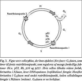 Cellecyklus kan anskueliggøres visuelt som en cyklus med fire faser og to restriktionspunkter. DNA-syntesen (replikationen) foregår i S-fasen, og celledelingen sker i M-fasen (mitosen). Regulering af cellecyklus er meget kompleks, og især restriktionspunkt 1 regulerer, hvorvidt cellen fortsætter videre ind i celledelingsfasen. Rb-proteinet (og andre proteiner) har betydning for regulering af restriktionspunkt 1. I G0 -fasen og tidlig G1 -fase er Rb-hypofosforyleret og bundet til transskriptionsfaktoren E2F. Efter fosforylering af Rb frigives E2F, og herved initieres transskription af gener, som er nødvendige for, at cellecyklus kan fortsætte ind i S-fasen (19, 20) (Fig. 3 ).