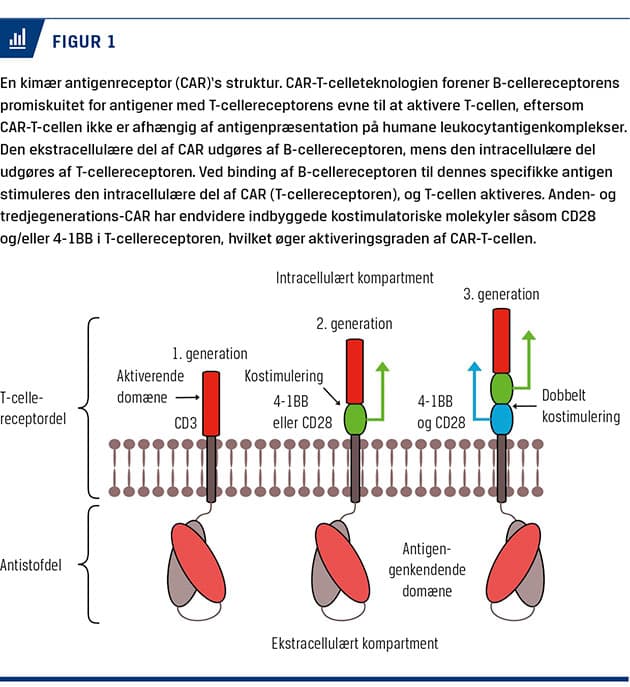 T-celler (CAR-T-celler) [1] (Figur 1), der har vist imponerende responser i behandlingen af akut lymfoblastær leukæmi (ALL). Det CD19-specifikke CAR-T-celleprodukt tisagenlecleucel er godkendt af European Medicines Agency (EMA) til behandling af børn og unge med relaps/refraktær (R/R) ALL, efter at et studie med 75 patienter viste en tremånedersremissionsrate på 81% og en median overlevelse (OS) på 19 måneder [2]. Produktet ventes snart godkendt til behandling af voksne. Ligeså er tisagenlecleucel godkendt til behandling af R/R diffust storcellet B-cellelymfom (DLBCL) hos voksne.