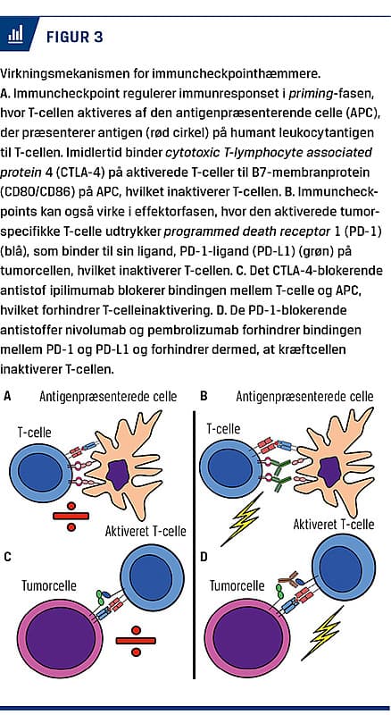 Behandling med immuncheckpointhæmmere (ICPH) har medført en stor ændring i behandlingsalgoritmen og prognosen for flere solide kræftformer. Virkningsmekanismen beror på en antistofmedieret blokering af immunhæmmende receptorer og deres ligander (Figur 3). Opdagelsen af disse immunhæmmende receptorer og deres ligander medførte for nylig tildelingen af Nobelprisen i Fysiologi eller Medicin til James Allison og Tasuku Honjo. Især programmed death receptor-1-
