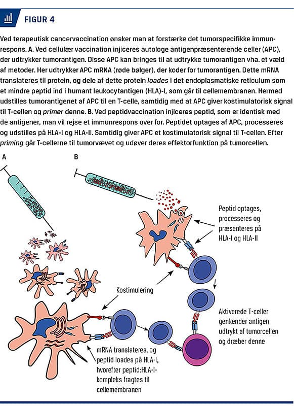 Terapeutisk cancervaccination har til formål at inducere et tumorspecifikt adaptivt immunrespons, hvor især et effektivt cellulært immunrespons er vigtigt for at opnå klinisk effekt. T-cellen genkender tumorcellen via udtryk af tumorantigener, og det er denne genkendelse, som forsøges forstærket ved cancervaccination (Figur 4). T-cellen kan genkende enten TAA eller tumorspecifikke antigener (TSA), som er antigener, der kun udtrykkes af de maligne celler. Især Wilms tumorantigen 1 (WT1), som er et TAA, der er højt udtrykt ved AML, er forsøgt som vaccinationsepitop talrige gange ved AML og MDS. Responsraten har været lav, men visse patienter er blevet kureret med WT1-vaccination [21]. New York esophageal squamous cell carcinoma 1 og pathogenesis-related protein 1 (PR1) er andre TAA-epitoper, hvoraf sidstnævnte i et nyligt publiceret studie, hvor man havde inkluderet patienter med AML, MDS og kronisk myeloid leukæmi, gav objektivt respons hos 12/53 evaluerbare patienter (24%). Desuden opnåede flere patienter med et PR1-specifikt immunrespons, et klinisk respons end patienter, som ikke havde et PR1-specifikt immunrespons (36% vs. 12%) [22]. I et cellulært vaccinationsstudie med patienter med AML i remission blev maligne myeloblaster fusioneret med autologe dendritiske celler og herefter injiceret fire gange subkutant, for at de dendritiske celler skulle præsentere TAA og TSA til effektor T-celler. Efter en medianopfølgningstid på 57 måneder var 71% af patienterne fortsat i remission [23]. Der er endnu ikke blevet gennemført nogen vaccinationsstudier inden for MPN. Den nyligt publicerede beskrivelse af det immunogene potentiale hos calreticulin- og Januskinase 2-drivermutationerne [24, 25], der ses hos samlet set 90% af patienterne med MPN, danner grundlag for at targetere disse to mutationer med peptidvaccination.