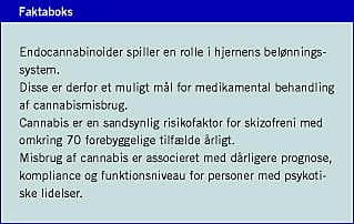 Sammenhænge mellem afhængighed af euforiserende stoffer og psykotiske tilstande er bedst undersøgt for cannabis. Vedrørende cannabis har specielt kausalitetshypotesen og selvmedicineringshypotesen været fremherskende. Sidste år blev der i The Lancet publiceret en metaanalyse, der viste, at risikoen for at udvikle en psykotisk tilstand var forøget med 40% blandt folk, der mindst en gang i deres liv havde brugt cannabis sammenlignet med folk, der aldrig havde brugt cannabis ([20] bl.a. baseret på artiklerne [21, 22]). Dette er naturligvis ikke et afgørende bevis for kausalitetshypotesen, men der er flere andre forhold, der tyder på en kausal sammenhæng. For det første var der tale om en dosis-respons-sammenhæng, således at personer med stort cannabisforbrug havde en mere end fordoblet risiko sammenlignet med dem, der aldrig havde indtaget cannabis. For det andet var der kun inkluderet studier med longitudinelle design, hvoraf de fleste havde kontrolleret for psykose eller psykoselignende oplevelser ved baseline . Antager man, at der er tale om en reel kausal effekt, vil elimination af cannabis som ætiologisk faktor kunne forebygge omkring 800 tilfælde af skizofreni årligt i Storbritannien, hvilket svarer til 70 tilfælde årligt i Danmark [23].