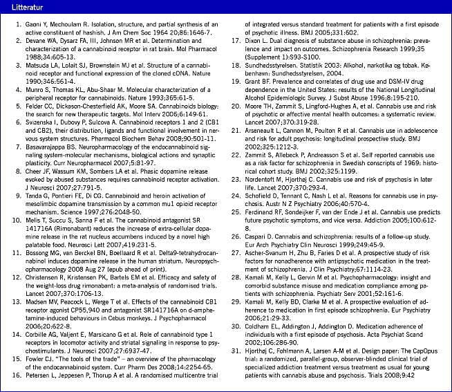 Blandt patienter med debuterende psykose, der er inkluderet i det danske OPUS-projekt, opfyldte 27% de diagnostiske kriterier for skadeligt brug eller afhængighed af alkohol eller stoffer, og cannabismisbrug var hyppigst forekommende [16], og tallet er højere blandt kroniske patienter [17]. Denne hyppighed er markant højere end i baggrundsbefolkningen [18, 19].