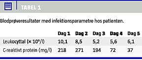 En 66-årig mand blev indlagt i konfus tilstand og med sløret tale. Han var forud for indlæggelsen blevet sat i behandling med azithromycin på grund af en formodet pneumoni. Patienten var på indlæggelsestidspunktet afebril, men blodprøverne viste let leukocytose (10,1 × 10 9 celler/l (referenceinterval: 3,5-8,8 × 10 9 celler/l)) og forhøjet C-reaktivt protein (218 mg/l) (Tabel 1 ). På grund af et anamnestisk stort alkoholforbrug havde man initielt mistanke om hepatisk encefalopati. Imidlertid udvikledes der nakkestivhed hos patienten, hvorfor der blev gennemført en lumbalpunktur. Analyse af cerebrospinalvæsken viste pleocytose (1.500 × 10 6 leukocytter/l; 74% polymorfnukleære celler), en lav glukosekoncentration på 0,2 mM (referenceinterval: 2,2-3,9 mM) og et forhøjet proteinindhold på 2,76 g/l (referenceinterval: 0,15-0,50 g/l). Ved direkte mikroskopi sås gramnegative stave i spinalvæsken. Empirisk meningitisbehandling med ceftriaxon og ampicillin blev iværksat, og på grund af udtalt dårlig tandstatus blev der tillagt metronidazol. En computertomografi af cerebrum afkræftede en mistanke om abscesdannelse. Dyrkning af spinalvæske var negativ, men ved 16S rRNA-analyse 11 dage efter lumbalpunkturen blev mikroorganismen fra spinalvæsken identificeret som værende C. canimorsus. Patienten berettede senere, at han i dagene op til indlæggelsen var blevet bidt af en hund. Han blev behandlet med antibiotika i sammenlagt 21 dage. Ved efterfølgende ambulant kontrol havde han persisterende høre- og synsstyrkenedsættelse.
