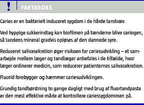 Caries er en af verdens almindeligst forekommende sygdomme og kan ramme alle aldersgrupper. Sygdommen beskrives af WHO som et globalt sundhedsproblem med en direkte indvirkning på livskvaliteten [1]. Omkring 25% af alle danske førskolebørn har stiftet bekendtskab med caries, hvilket gør sygdommen fem gange mere almindelig end astma og syv gange mere almindelig end høfeber og allergi. Prævalensen stiger gennem skoletiden, og kun ca. 30% af de danske teenagere har et fyldningsfrit tandsæt [2]. Forekomsten af caries er hyppigere blandt socialt og økonomisk »svage grupper« og i visse etniske indvandrergrupper [3]. De seneste 30-40 år har der været en forbedring i tandsundheden hos børn og unge i Danmark. Paradoksalt nok øges i disse år risikoen for caries i den voksne og ældre del af befolkningen, fordi befolkningen beholder deres tænder længere [4]. Mange ældre lider desuden af sygdomme og tilstande med hertil relateret polyfarmaci, som ofte påvirker salivafunktionen negativt og øger risikoen for udvikling af caries [5].