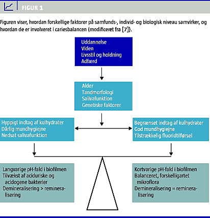 Bakteriekoloniseringen af mundhulen er meget vigtig for det orale økosystem. Den differentierede biofilm modvirker eksempelvis kolonisationen af patogene bakterier. Den tidlige kolonisering af barnets mund styres først og fremmest af, hvilke bakterier barnet eksponeres for, men også af genetiske og immunologiske faktorer. Da epitelcellerne, der beklæder de orale slimhinder, kontinuerligt afstødes, ses der sjældent ophobninger af mikroorganismer, før tænderne bryder frem. Tændernes overflader består derimod af avital emalje, så de mikroorganismer, der hæfter sig på tænder, bliver siddende til de fjernes mekanisk, eksempelvis af en tandbørste. Der hvor den mekaniske funktion er nedsat, ophober mikroorganismerne sig og kan blive til synlige ansamlinger, der kaldes plak. Sådanne områder kaldes plakstagnationsområder og findes langs gingiva, approksimalt (mellem tænderne) og okklusalt (tyggefladerne). Interessant nok er det lige der, caries udvikles. Den økologiske plakhypotese bygger på, at den orale biofilm reagerer på det forandrede miljø, som opstår ved en økologisk belastning i form af en lav pH-værdi [6]. Biofilmen tilpasser sig det sure miljø ved at syreproducerende bakterier og bakteriearter, der kan tåle syrer, fremmes på bekostning af de, der ikke kan tåle sure forhold. Nettoresultatet bliver en overvækst af aciduriske bakterier og mindre diversitet. De bakterier, som dominerer den cariogene plak, tilhører grupperne mutans streptokokker, Lactobacillus-,Actinomyses- og Veillonella- arter. Sukkerbelastningen fremmer endog de syreproducerende bakteriers ekstracellulære polysakkaridproduktion, hvilket gør biofilmen tykkere og øger dens adhæsion til tandoverfladen. Emaljen, som hovedsageligt består af hydroxylapatitkrystaller, demineraliseres gradvist, når pH i biofilmen falder til under 5,5. Stiger pH igen, kan noget af det mineral, der er blevet udfældet, gendannes, hvilket kaldes remineralisering. De- og remineralisering veksler lokalt, men hvis demineraliseringen dominerer over længere tid, bryder tandoverfladen sammen, og der opstår en kavitet. De vigtigste faktorer i cariesbalancen er sammenfattet i Figur 1 .
