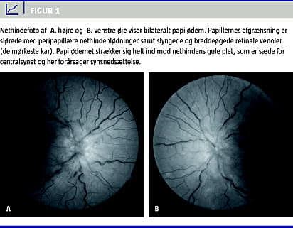 En tidligere rask 32-årig kvinde af libanesisk herkomst blev henvist til neurologisk afdeling på grund af hovedpine gennem seks måneder og 14 dage varende bilateral synsnedsættelse, intermitterende dobbeltsyn og tinnitus. Ved en objektiv undersøgelse blev der fundet visusnedsættelse til 2/60 på højre øje og til fingertælling på venstre øje, diskret bilateral abducenspåvirkning, forstørrede blinde pletter ved synsfeltundersøgelse og en oftalmoskopisk undersøgelse viste udtalt bilateralt papilødem (Figur 1 ).