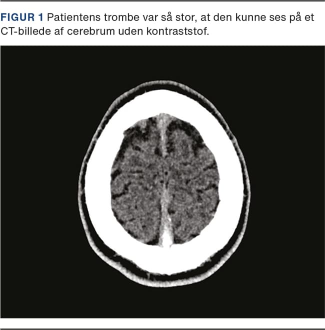 CT af cerebrum uden kontraststof (Figur 1) viste tydeligt trombose i sinus sagittalis superior, hvilket blev bekræftet ved MR-skanning af cerebrum med venøse sekvenser. Der var ingen venøse infarkter i hjerneparenkymet. Der blev akut påbegyndt behandling med LMWH fra første indlæggelsesdøgn, og senere blev der skiftet til warfarin, hvorefter tilstanden var velkontrolleret med international normaliseret ratio på 2-3.