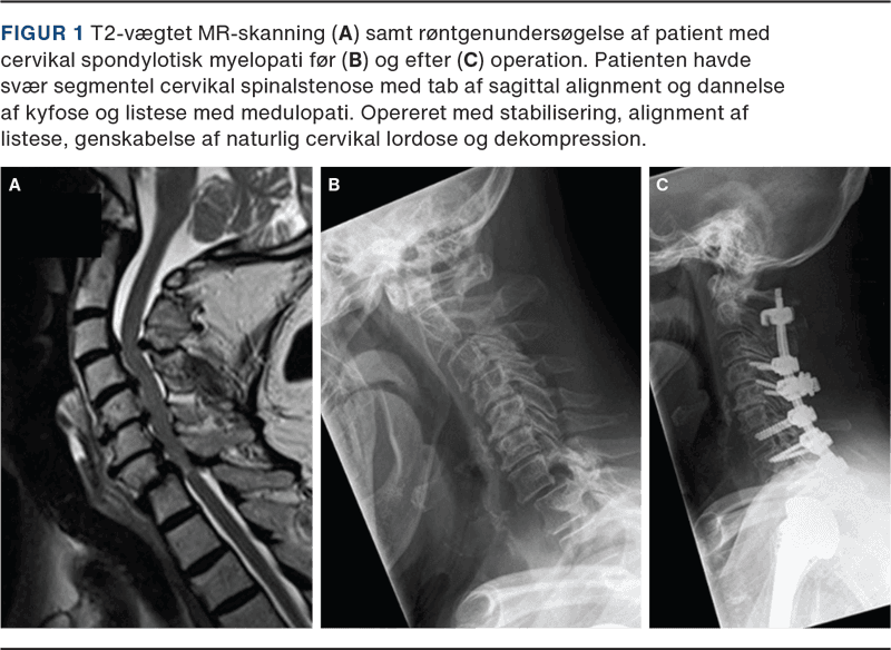 Den kirurgiske behandling bygger på en pladsgivende operation med dekompression af nerverne samt evt. korrektion af sagittal alignment [25]. Der findes tre operative muligheder: en anterior, posterior og kombineret adgang. Litteraturen har trods adskillelige forsøg ikke kunnet påvise en entydig/overbevisende overlegenhed ved den ene tilgang sammenlignet med den anden. Valget beror i stedet primært på tilstedeværelsen af cervikal kyfose/lordose, anatomisk placering af stenosen, antal afficerede segmenter samt operatørens præference [15, 26, 27]. De operative indgreb kan med eller uden instrumenteret fusion indbefatte korpektomi, laminektomi, diskektomi, laminoplastik samt fusion ved tab af sagittal alignment [26].