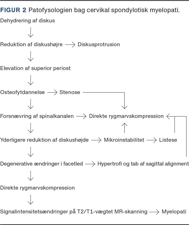 Selvom patofysiologien ikke er fuldt klarlagt, menes den at være multifaktoriel og kan groft inddeles i statisk og dynamisk kompression. Statisk kompression inkluderer medfødte og erhvervede tilstande såsom kongenit spinalstenose, diskusherniering, osteofytdannelse, indfoldning af ligamentum flavum og facetledskapsel samt ligamentøs hypertrofi (Figur 2) [2, 12-15]. Konsensus er, at den statiske kompression af rygmarven og dertilhørende reducerede blodtilførsel kan forårsage lokal intraparenkymal iskæmi, som frembringer et neuroinflammatorisk respons af mikroglia og makrofager, hvilket bevirker til neural degeneration. I sene stadier forekommer endotelcelledysfunktion i blod-rygmarvs-barrieren, hvilket yderligere aktiverer immuncelleinfiltration. Derved kan kompression bl.a. forårsage neuronal og oligodendroglial apoptose, neural demyelinisering, astrogliose og aksonal degeneration [5, 12].